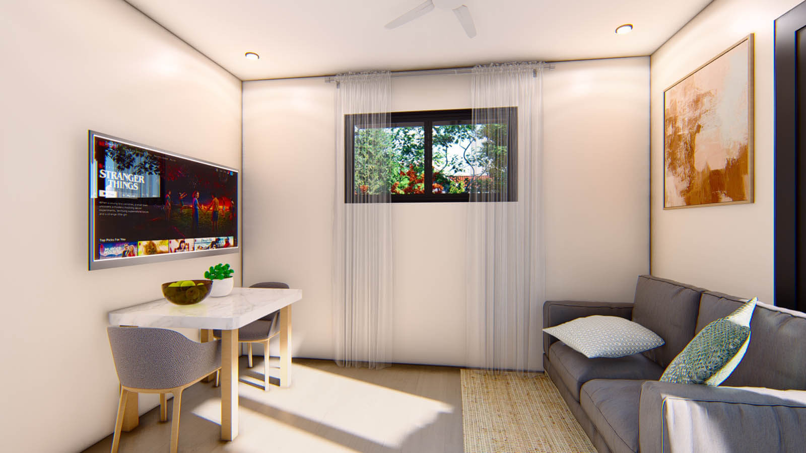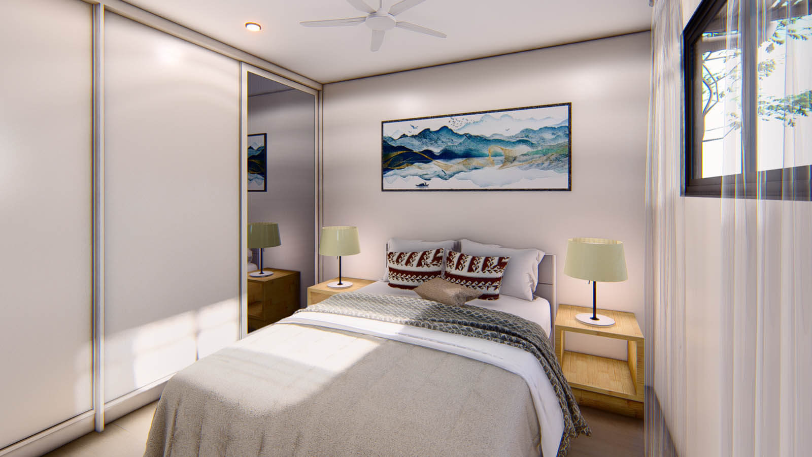 Bedrooms and living rooms fitted with four-blade ceiling fans.