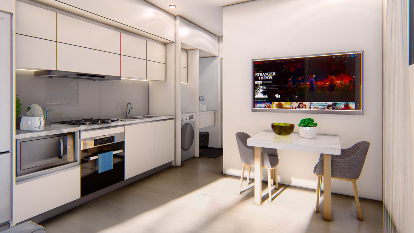 All rooms are 2550mm high with a square set finish to wall and ceiling. Choice of two different options of timber hardwood flooring.